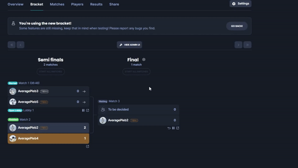 The Admin UI will provide you with all the tools you need to manage the matches in your tournament. The tools you usually find, and still can find, in Match Details or the Lobby View has been added to the Admin UI in the Bracket.