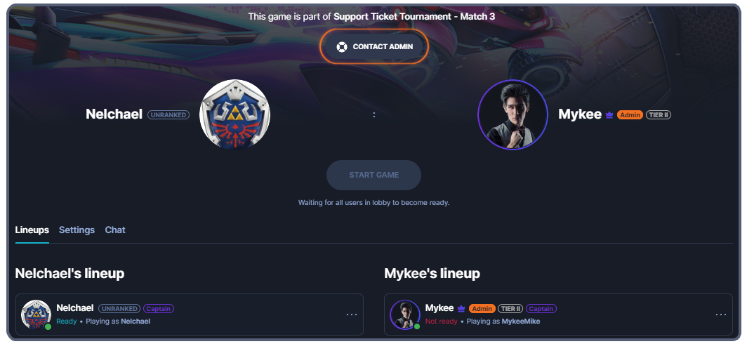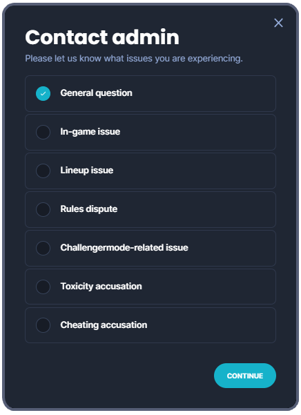 While there's an active tournament, the players can also find a Contact Admin button in their Challengermode Lobby. They can send a Support Ticket by clicking this button. When they do, they'll be presented with the ticketing system described above.