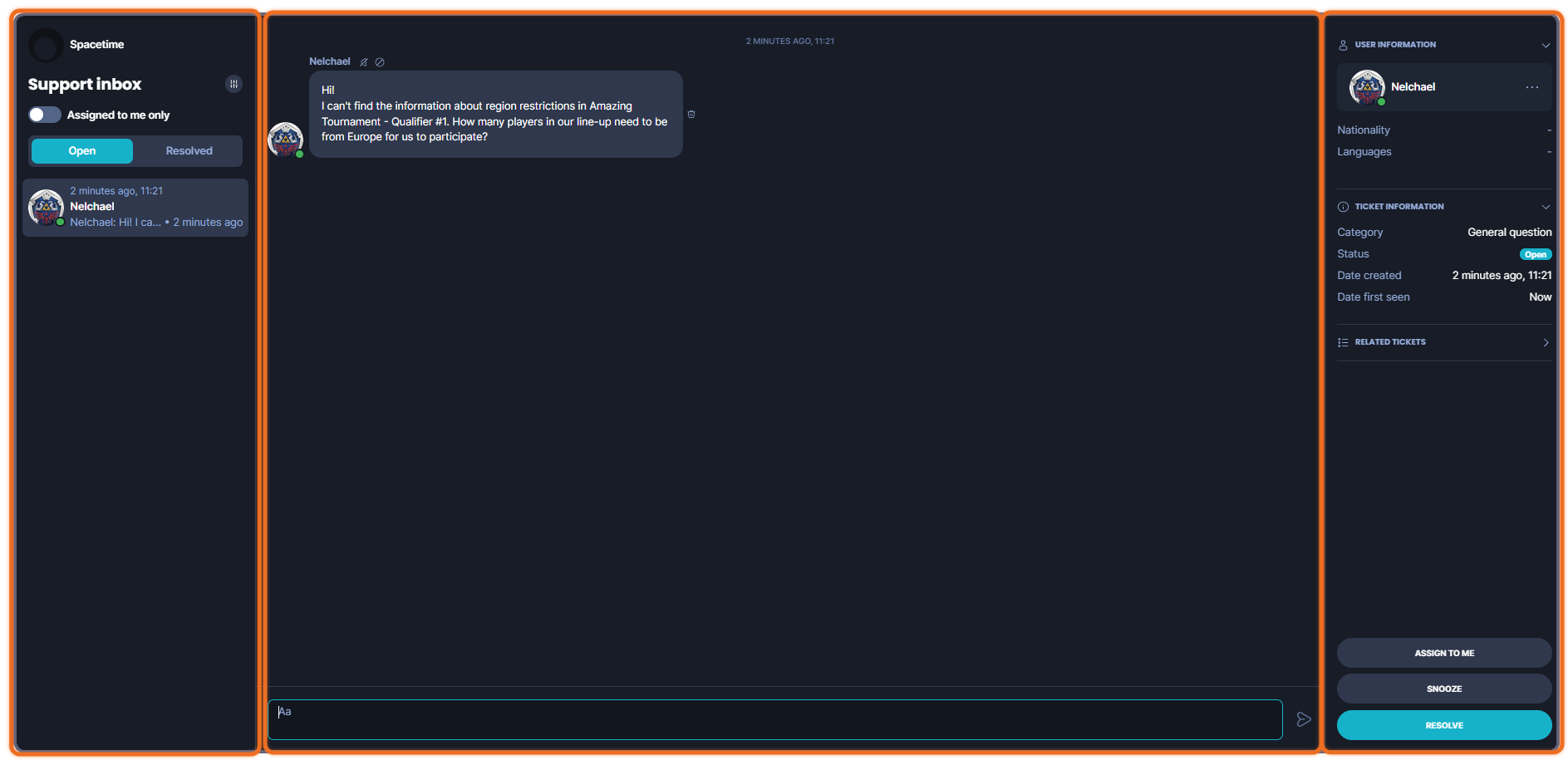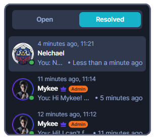 On the left side, you have your Support Inbox, this is where all incoming support tickets will appear. To view previously closed tickets, you can click the Resolved button at the top of the Support Inbox. While actively administering a tournament, you would however spend most of your time in the Open view.